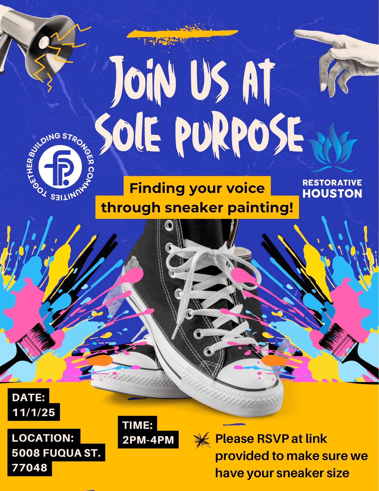 Our next monthly Circle is on November 1. We will be painting sneakers to find our “sole” purpose! Youth and adults welcome. Register here: